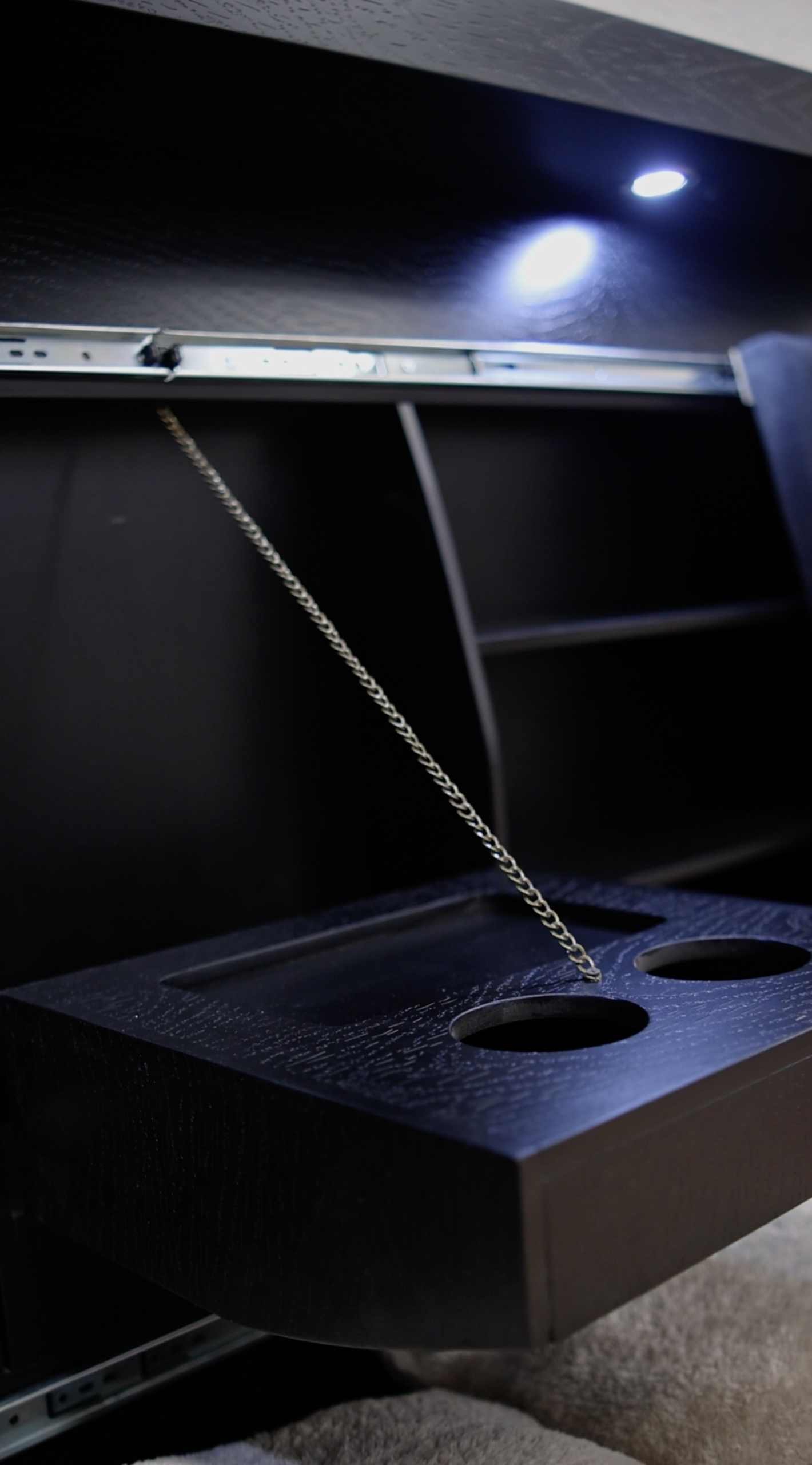 Fabricada con melamina, esta recámara se distingue por su imponente cabecera con puertas deslizables y luz integrada ofrece un espacio organizado e iluminado al alcance de tu mano. Complementada con dos burós con cajones y servicios ocultos; un espejo giratorio, una práctica cajonera de 5 cajones y un elegante baúl tapizado con almacenaje, esta recámara lo tiene todo para que vivas con orden y estilo.