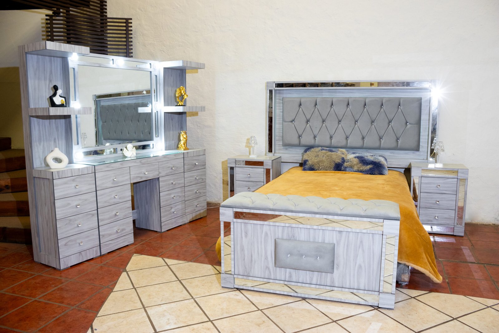 Los dos burós son simétricos, con cajones amplios y jaladores de cristal, ideales para organizar tu espacio al alcance de la mano. El baúl al pie de cama añade almacenamiento elegante con su panel tapizado frontal.