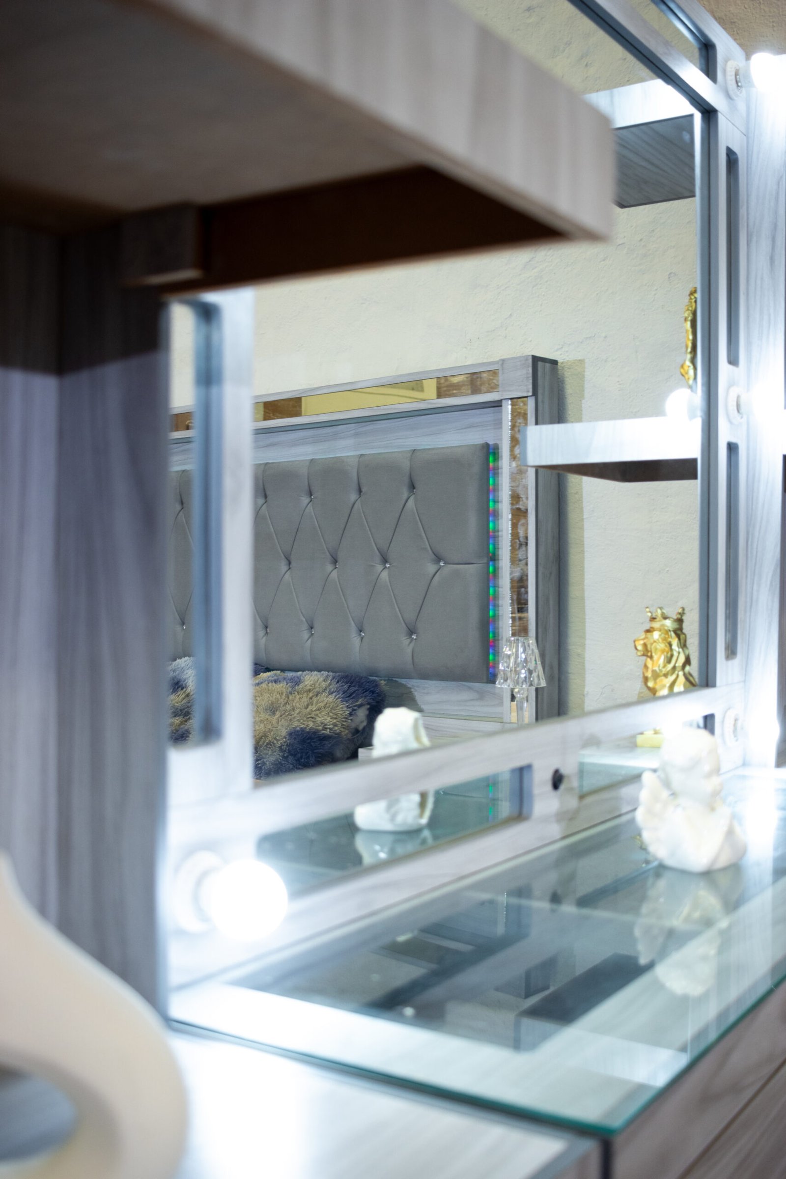 Elegancia y funcionalidad en perfecta armonía. La recámara Confort transforma tu espacio en un refugio de lujo accesible, con acabados espejados y tapicería capitoné que le dan un toque glamoroso y sofisticado.