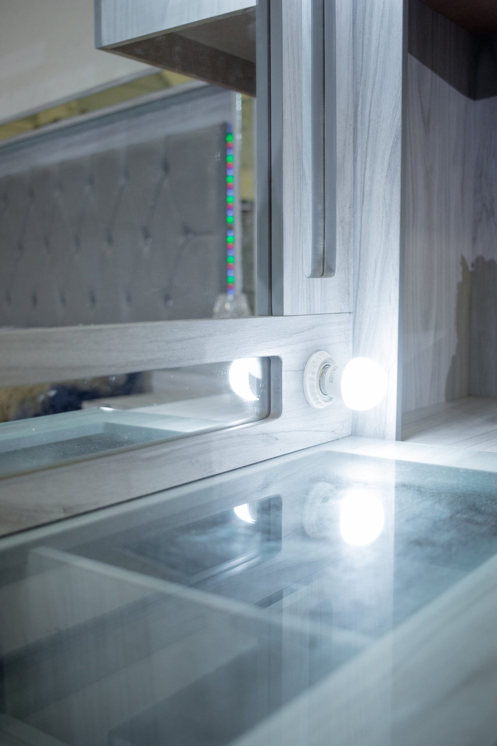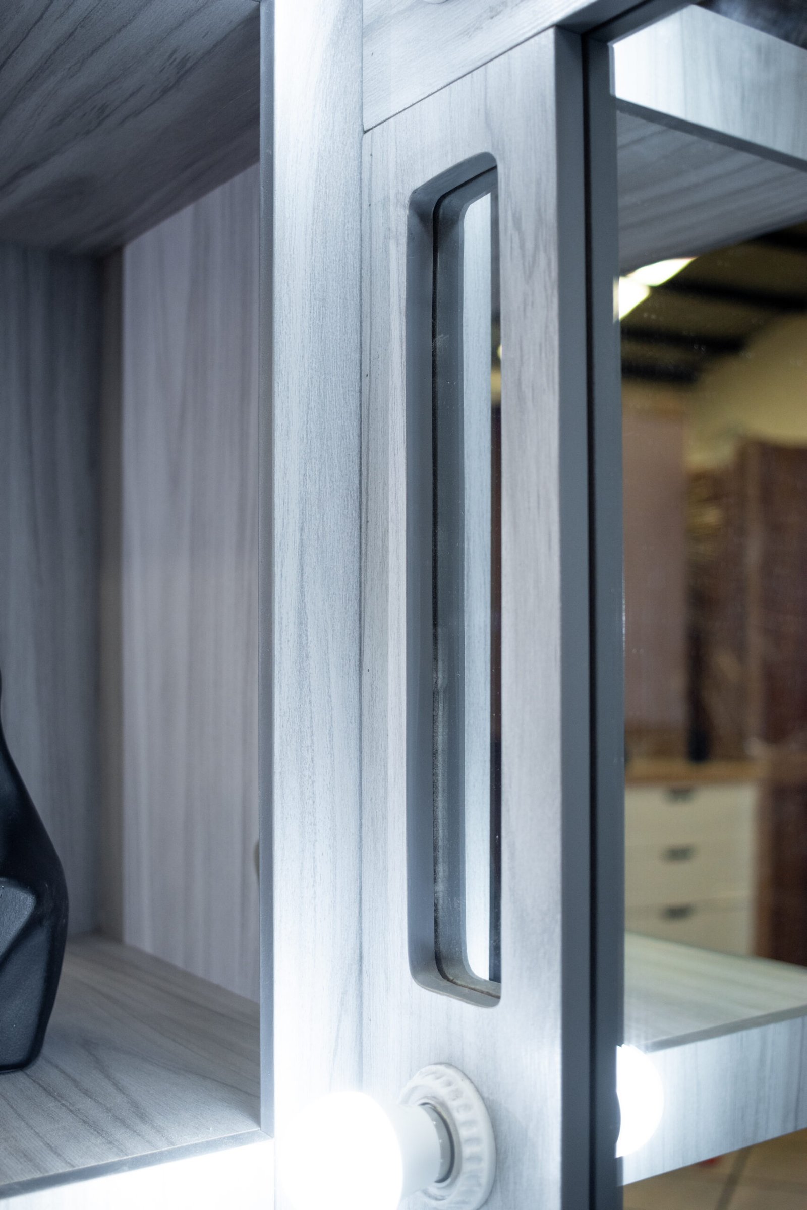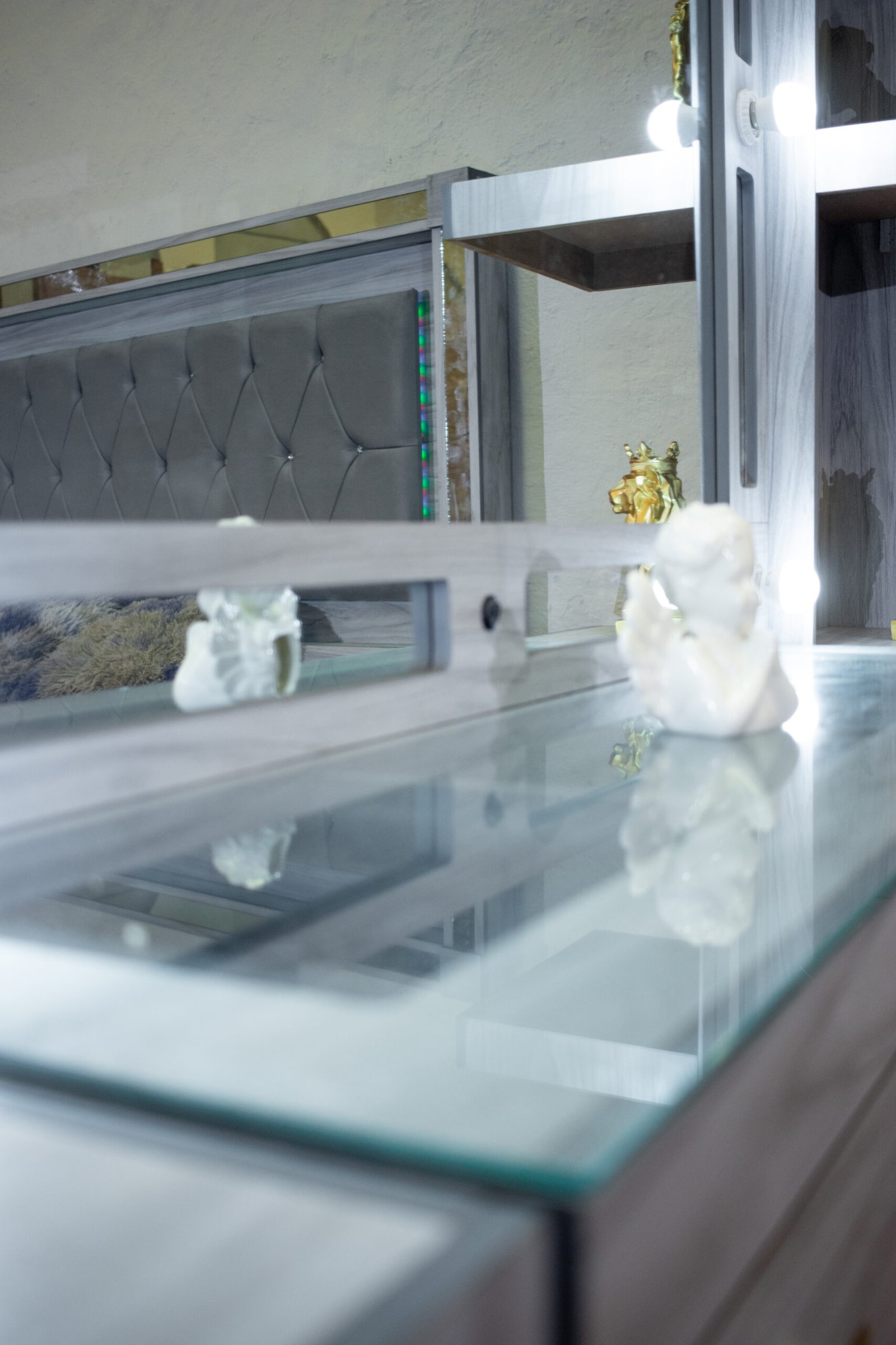 El tocador es la pieza más completa del conjunto: cuenta con espejo central iluminado, dos pilares laterales con entrepaños para decoración y almacenaje, y una amplia gaveta de cajones con jaladores de cristal.