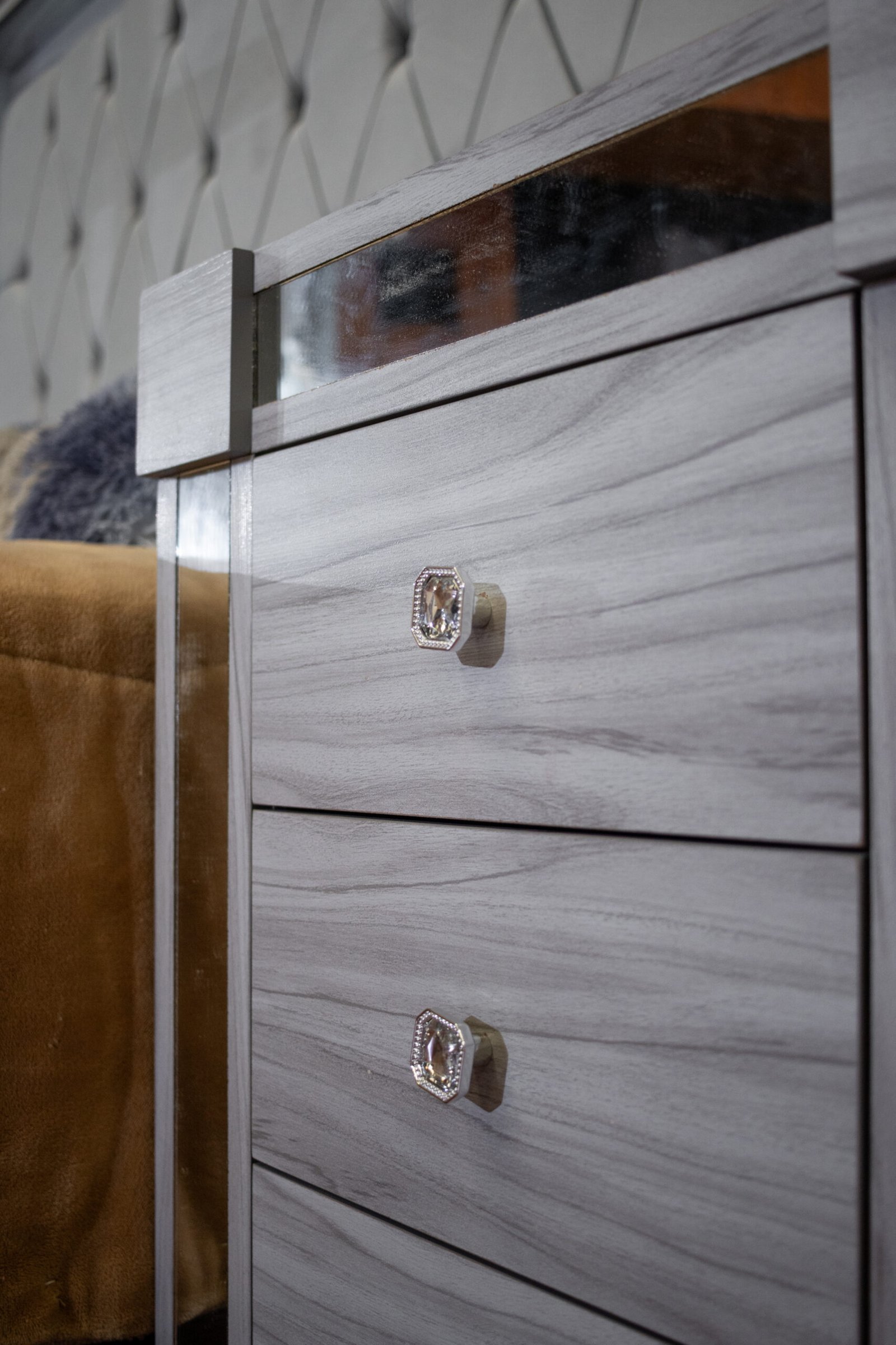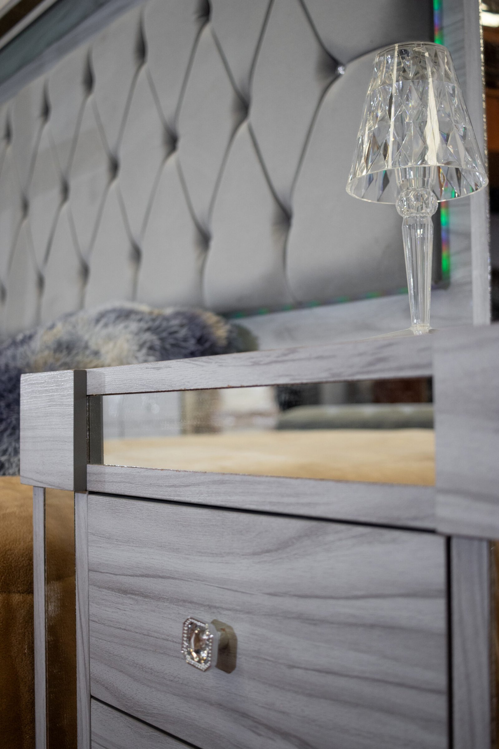 La cabecera Confort es el elemento central del juego: amplia y majestuosa, con capitoné y botones de cristal que aportan textura y brillo. Su marco espejado le otorga un acabado de alto impacto visual.