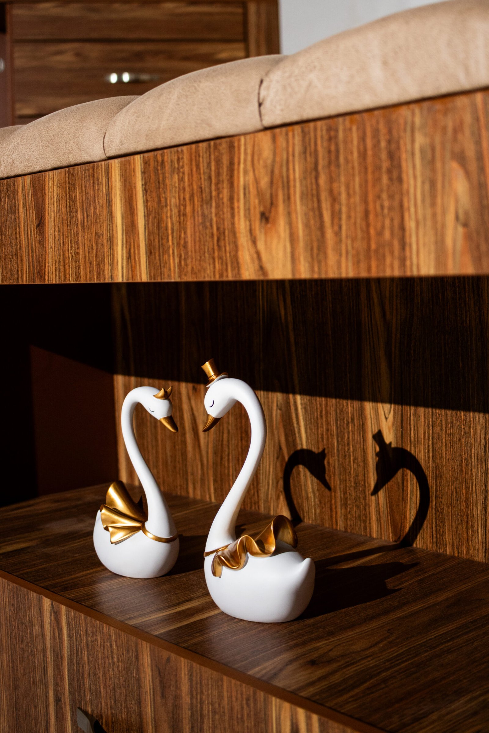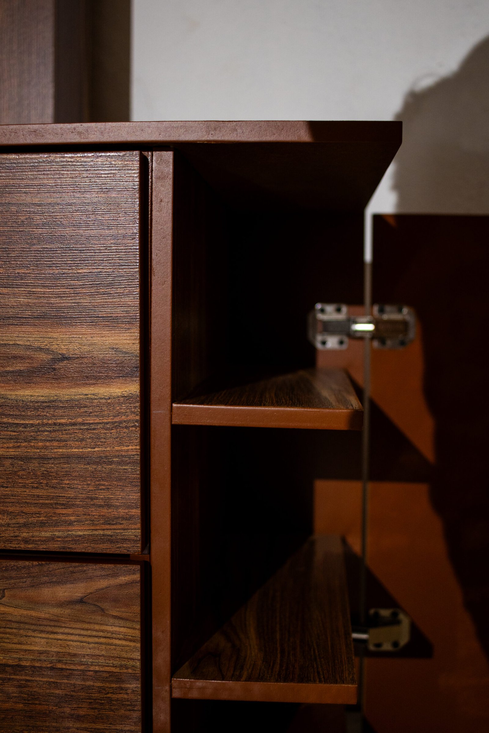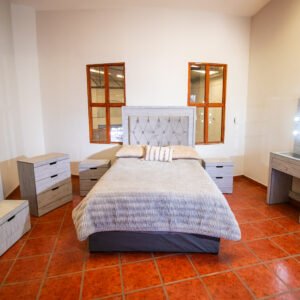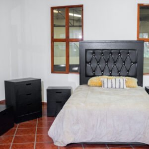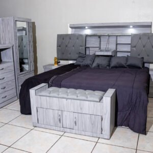 Los dos burós se integran de forma fluida a los costados de la cama, con cajones de fácil acceso y espacios discretos para guardar lo que más valoras. La cajonera alta complementa la organización del cuarto con múltiples cajones y compartimentos ocultos que maximizan el almacenamiento sin sacrificar la estética.