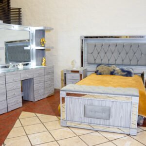 La pieza más sorprendente del juego es el espejo giratorio de cuerpo completo: a simple vista funciona como un espejo elegante con repisas decorativas, pero al girarlo revela un sistema de compartimentos secretos en su interior, ideal para joyería, documentos o artículos personales. El baúl al pie de cama, con asiento acolchado capitoné y cajón inferior, cierra el conjunto con practicidad y estilo.