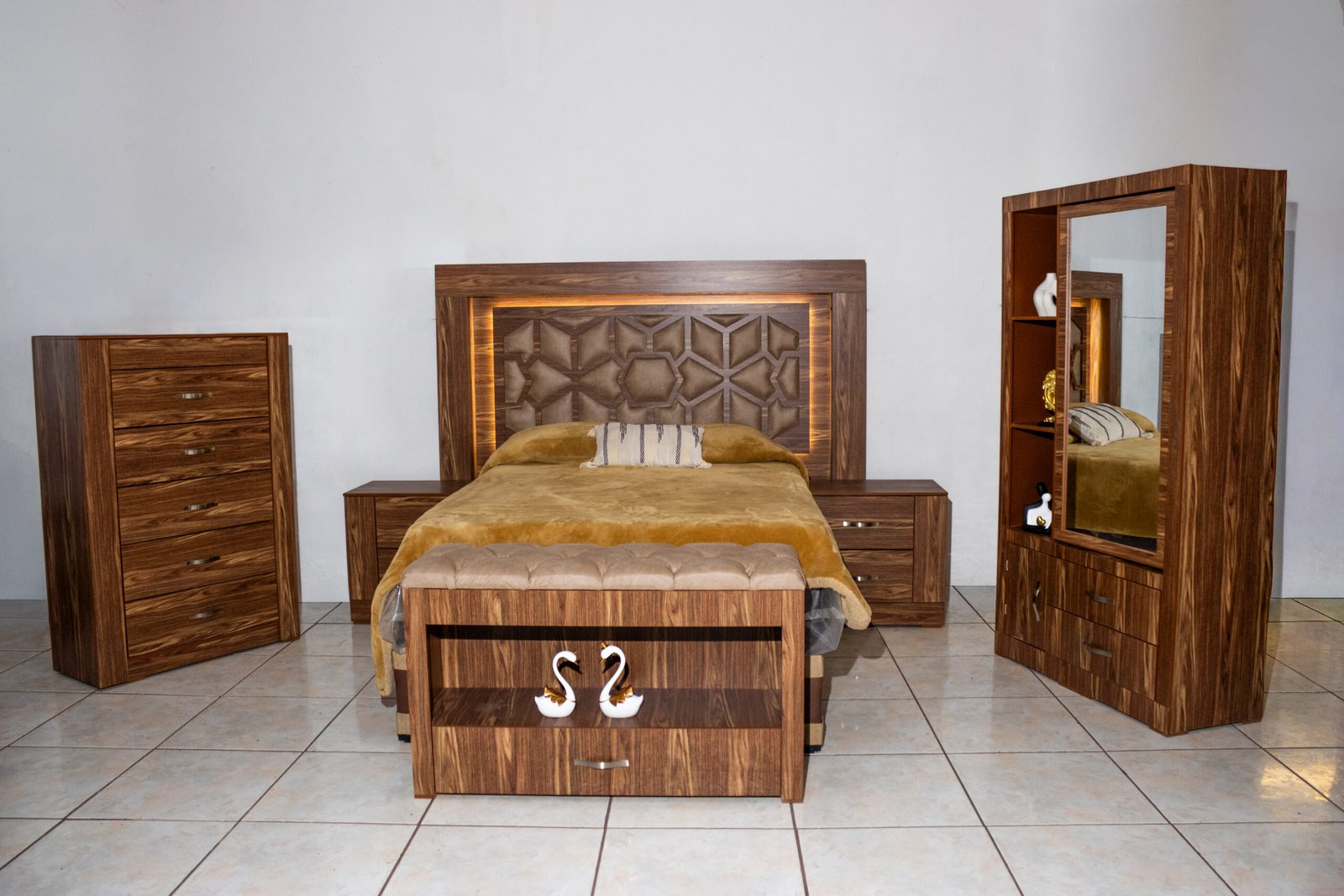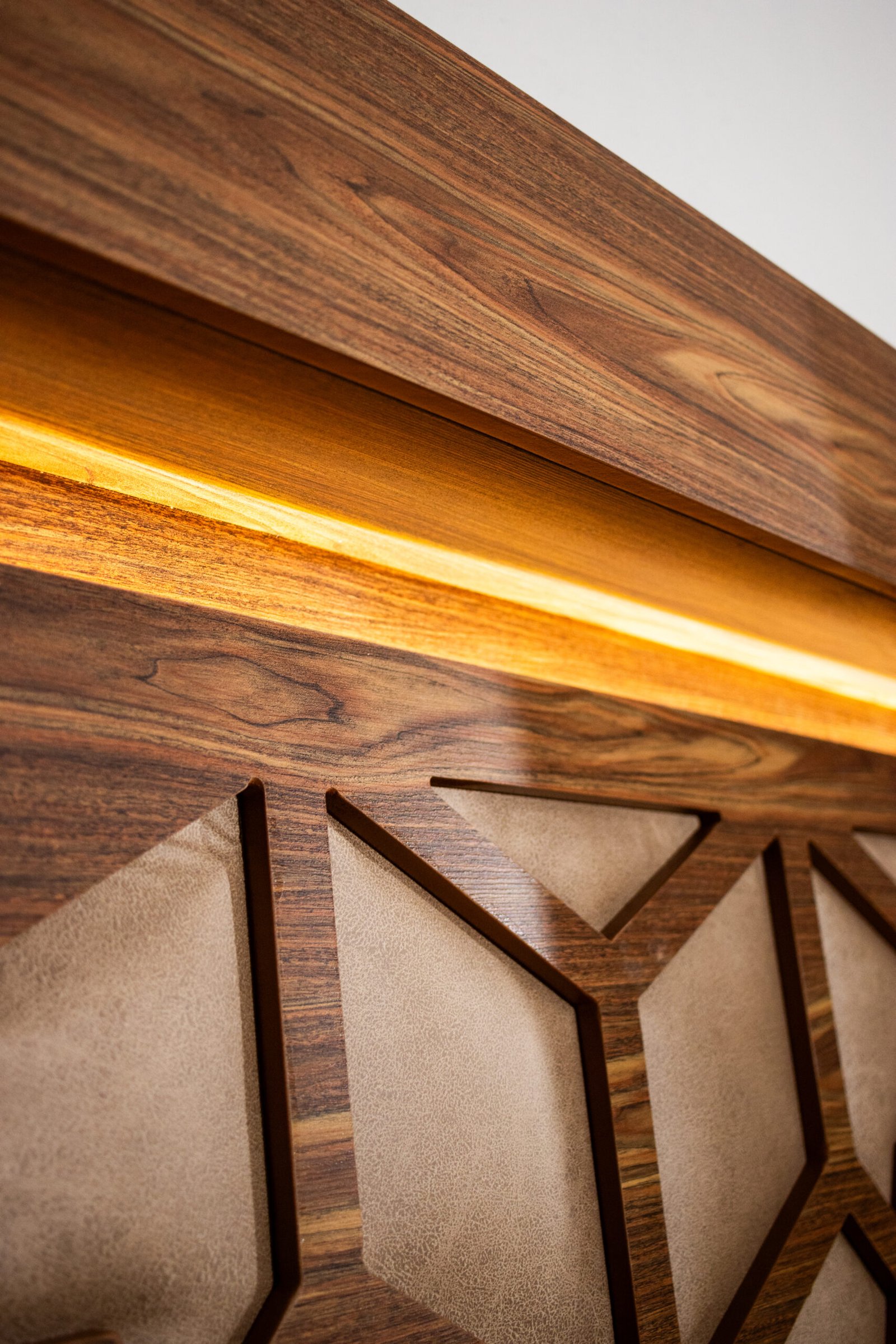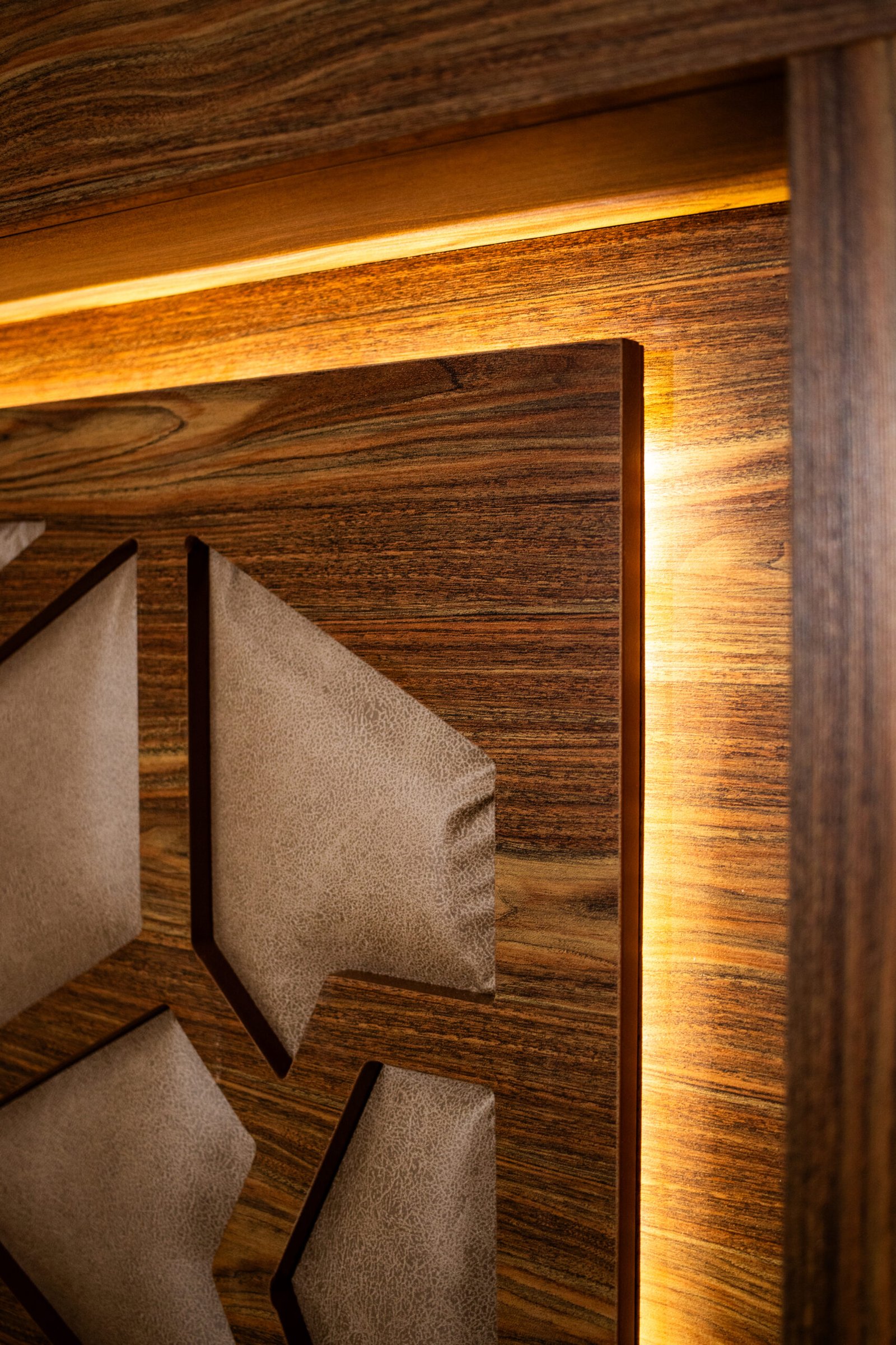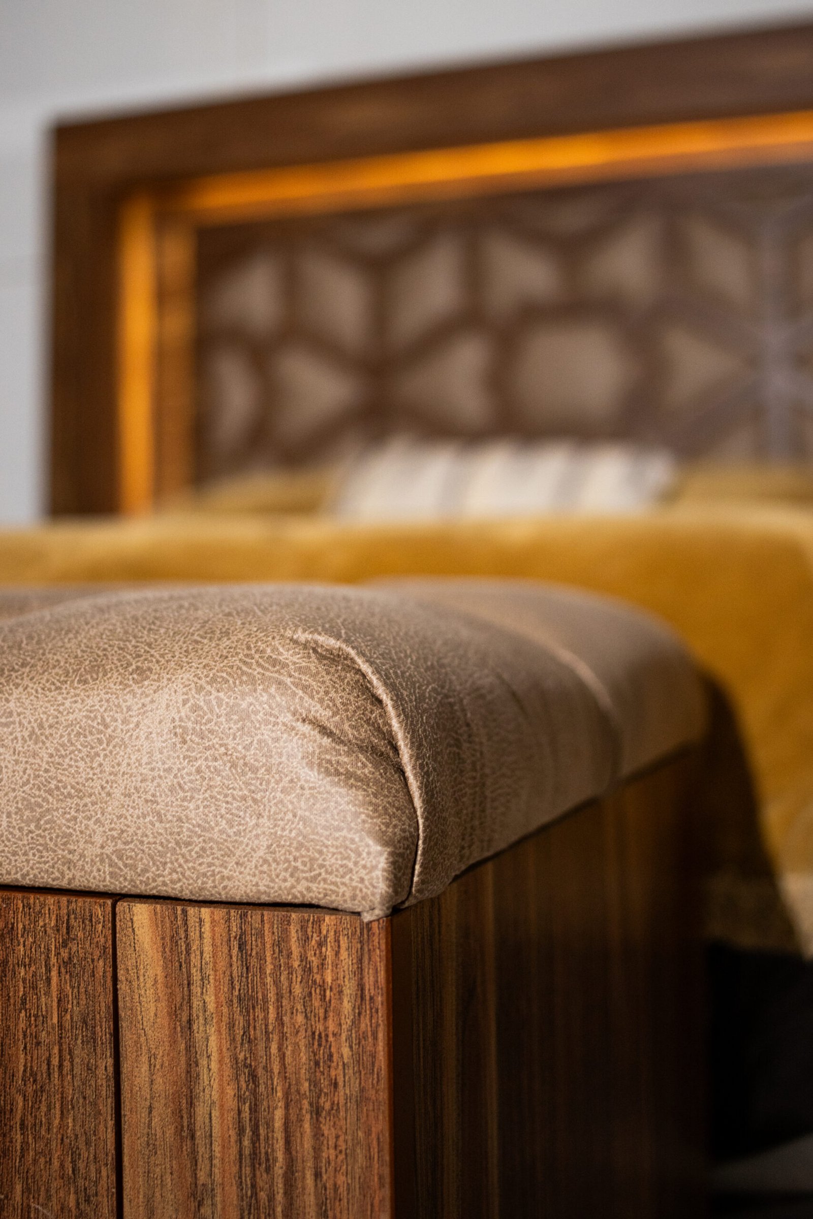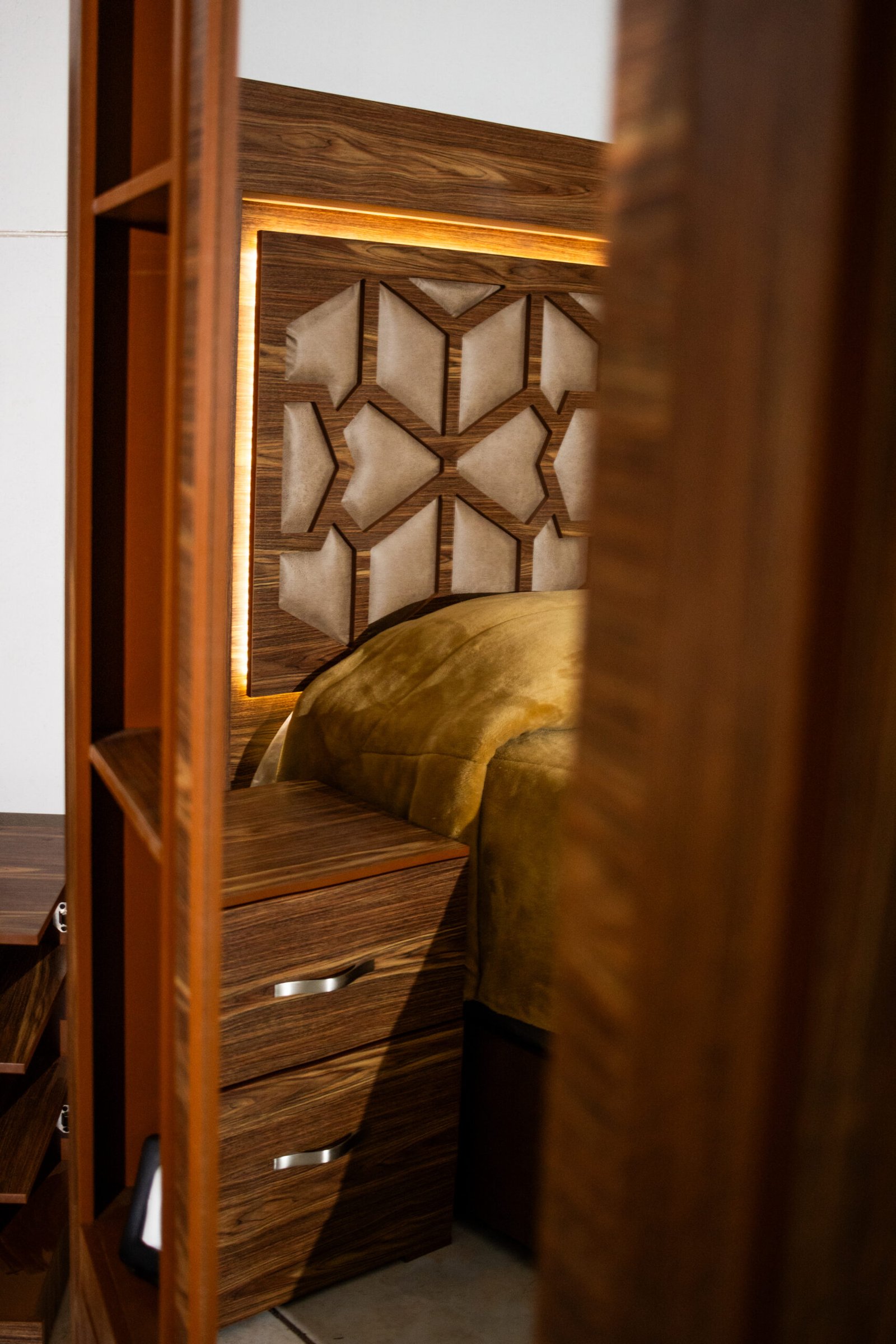 La Recámara Gitana es una obra de autor: su panel central lleva un tallado geométrico de inspiración árabe con tapicería en tela café dorado, enmarcada por una franja de luz LED cálida que crea una atmósfera única al encenderla. El marco exterior en madera con veta cebra le da presencia y carácter.