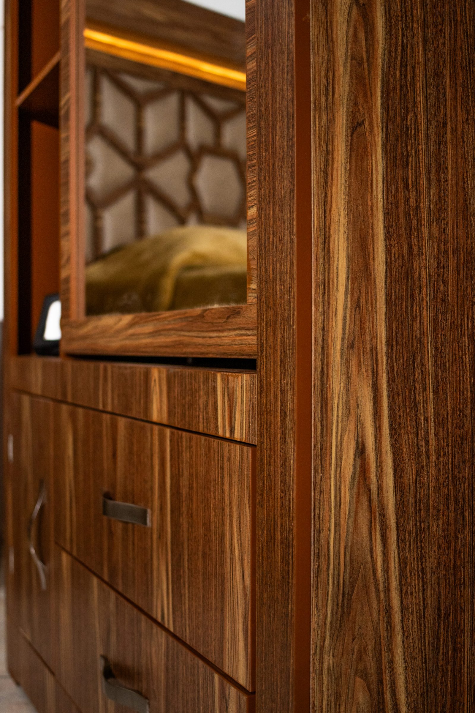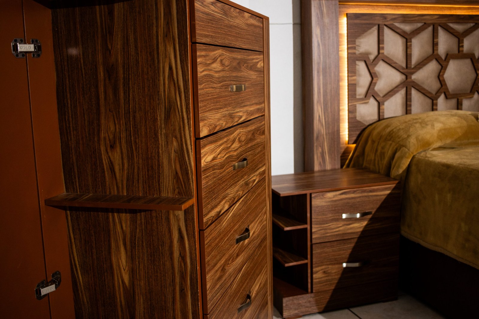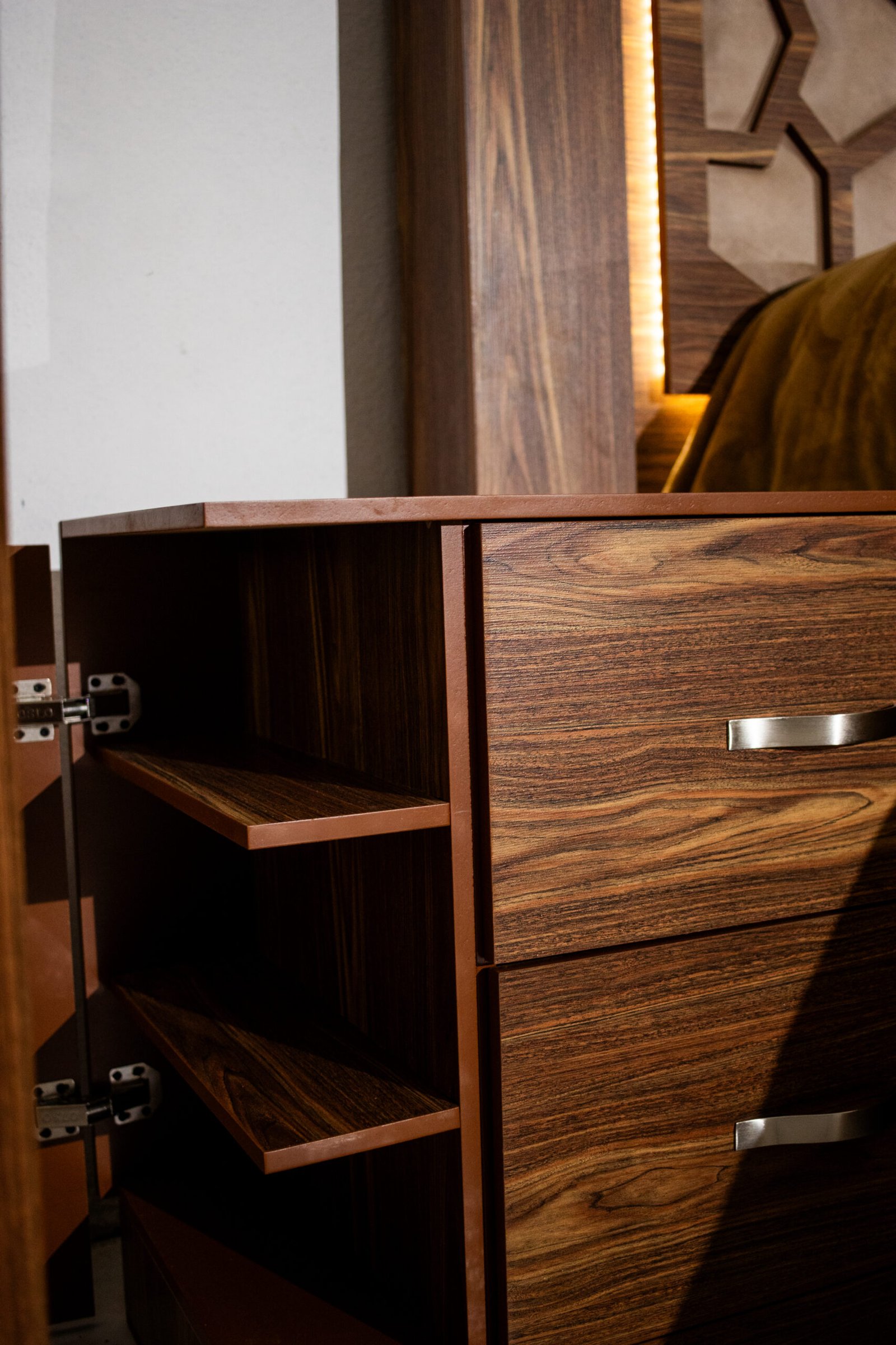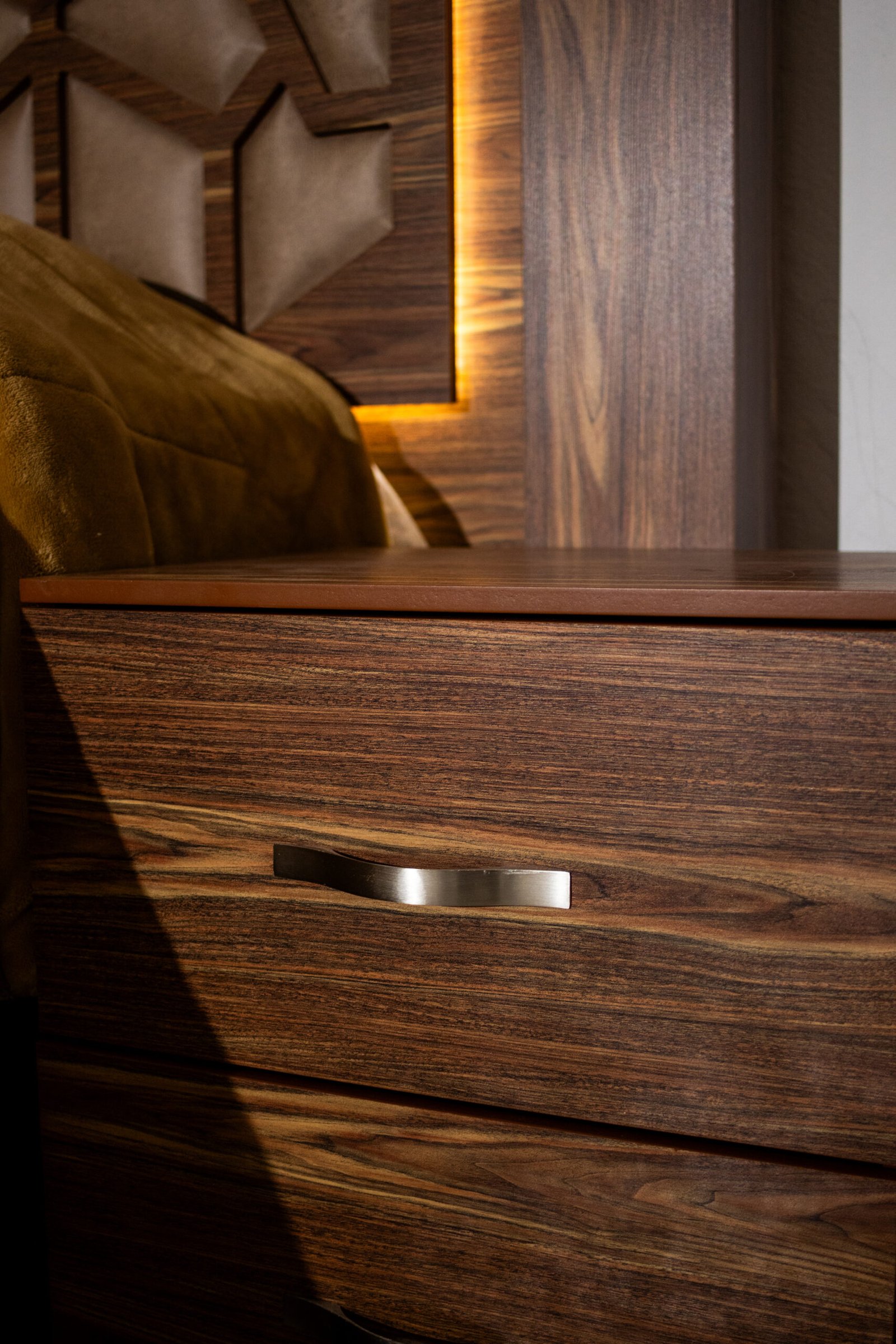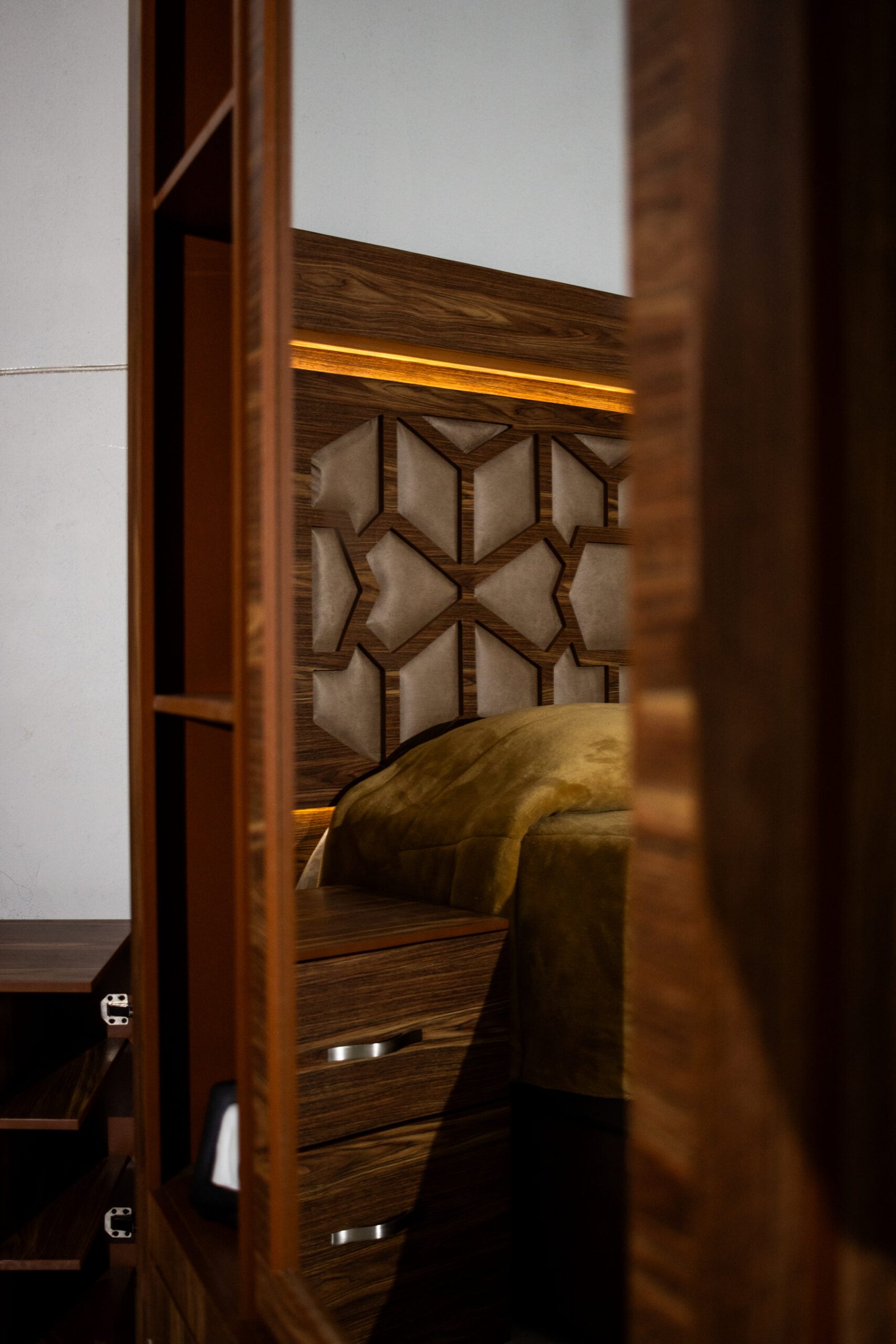 La Recámara Gitana es una obra de autor: su panel central lleva un tallado geométrico de inspiración árabe con tapicería en tela café dorado, enmarcada por una franja de luz LED cálida que crea una atmósfera única al encenderla. El marco exterior en madera con veta cebra le da presencia y carácter.