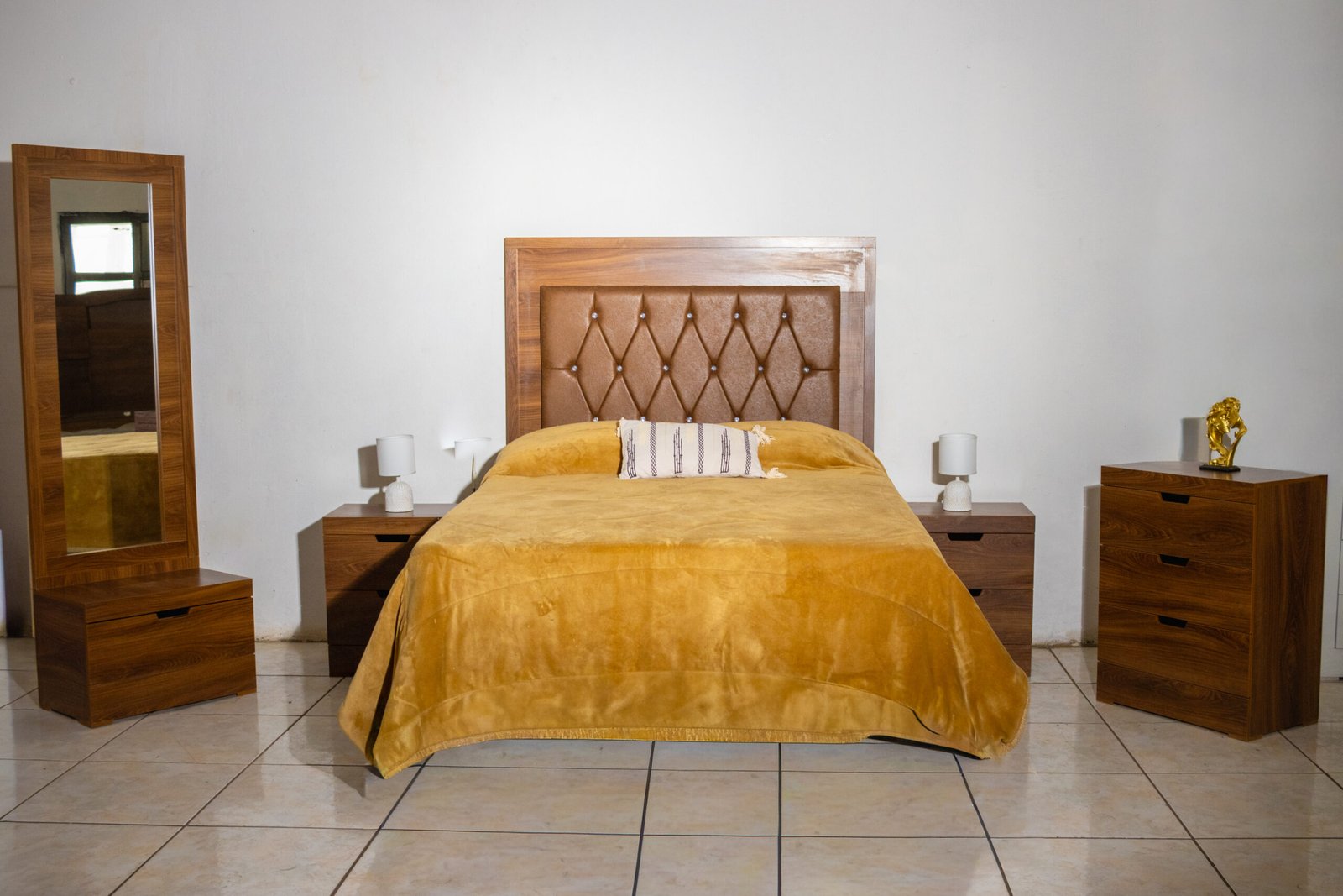 La Recámara Mayte apuesta por la sencillez con carácter: su tapicería capitoné en tela contrasta con el marco, logrando una presencia elegante sin ornamentos innecesarios. Es el tipo de pieza que nunca pasa de moda.