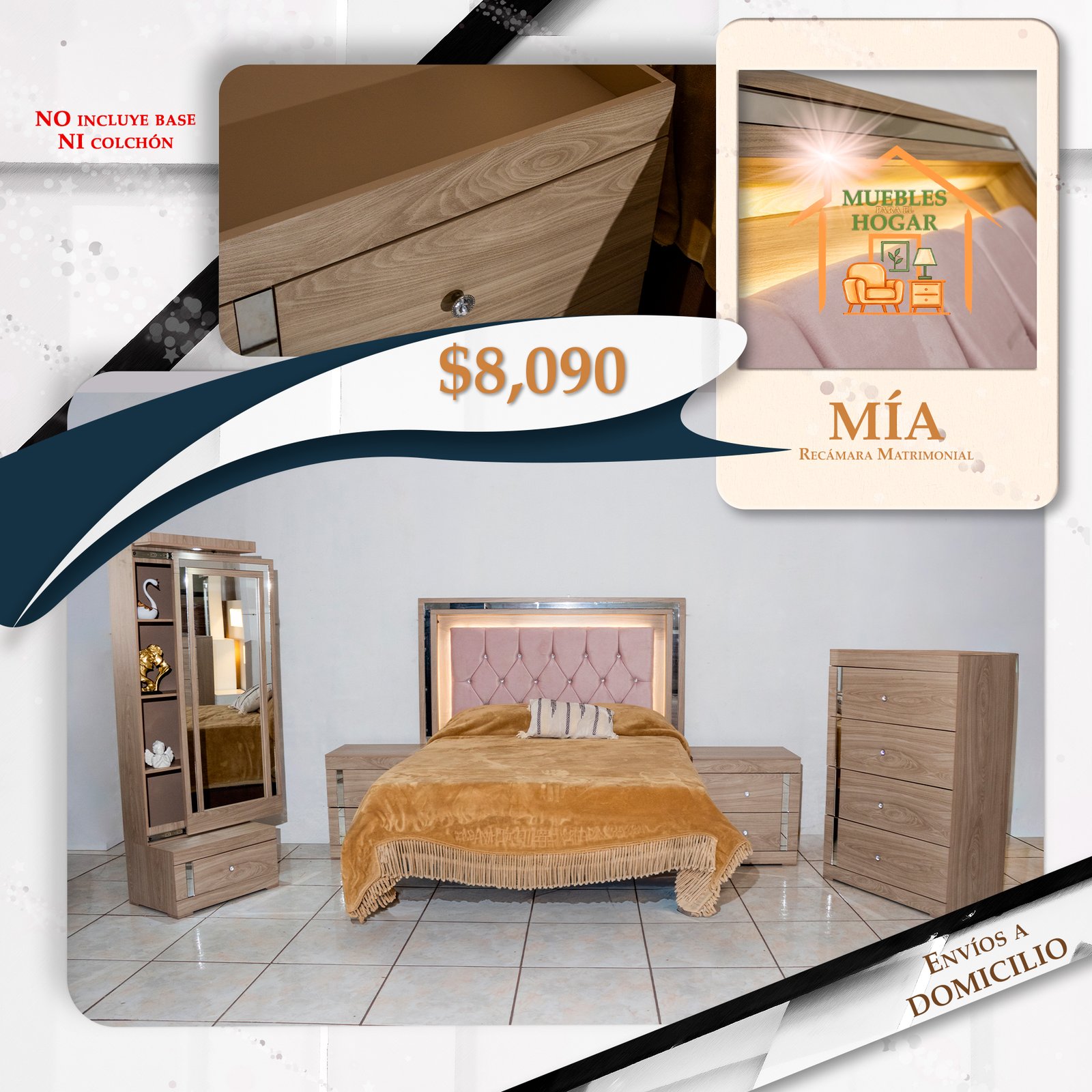 Los dos burós mantienen la coherencia del conjunto con sus cantos espejados verticales y jaladores de cristal: funcionales, elegantes y perfectamente integrados al lenguaje visual de la Mia.