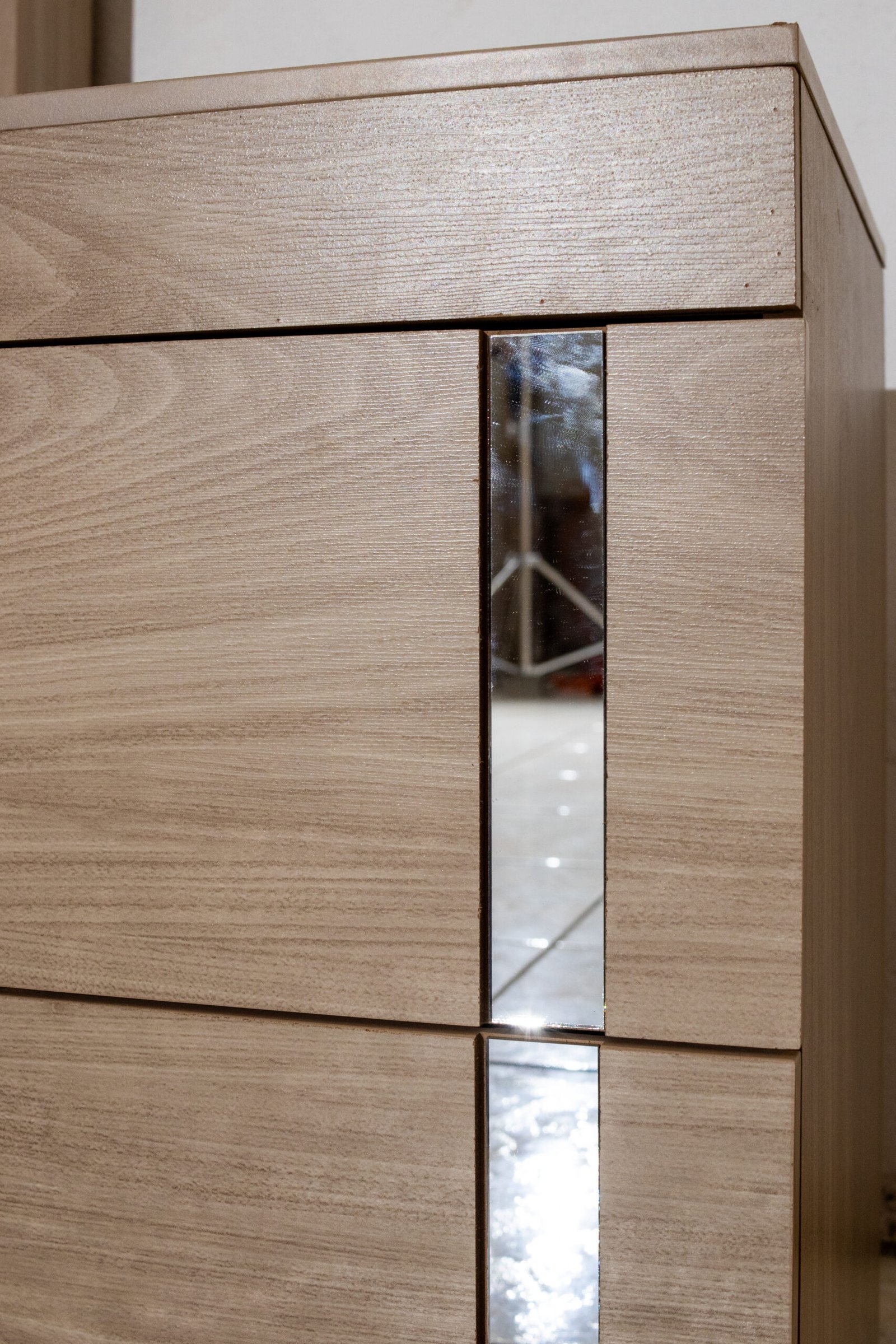 La cajonera cierra el juego con otra sorpresa: además de sus cajones con cantos espejados y jaladores de cristal, su tapa superior se levanta para descubrir un compartimento oculto integrado en la estructura, ideal para joyería, documentos o artículos de valor. Ingenio y estilo en la misma pieza.