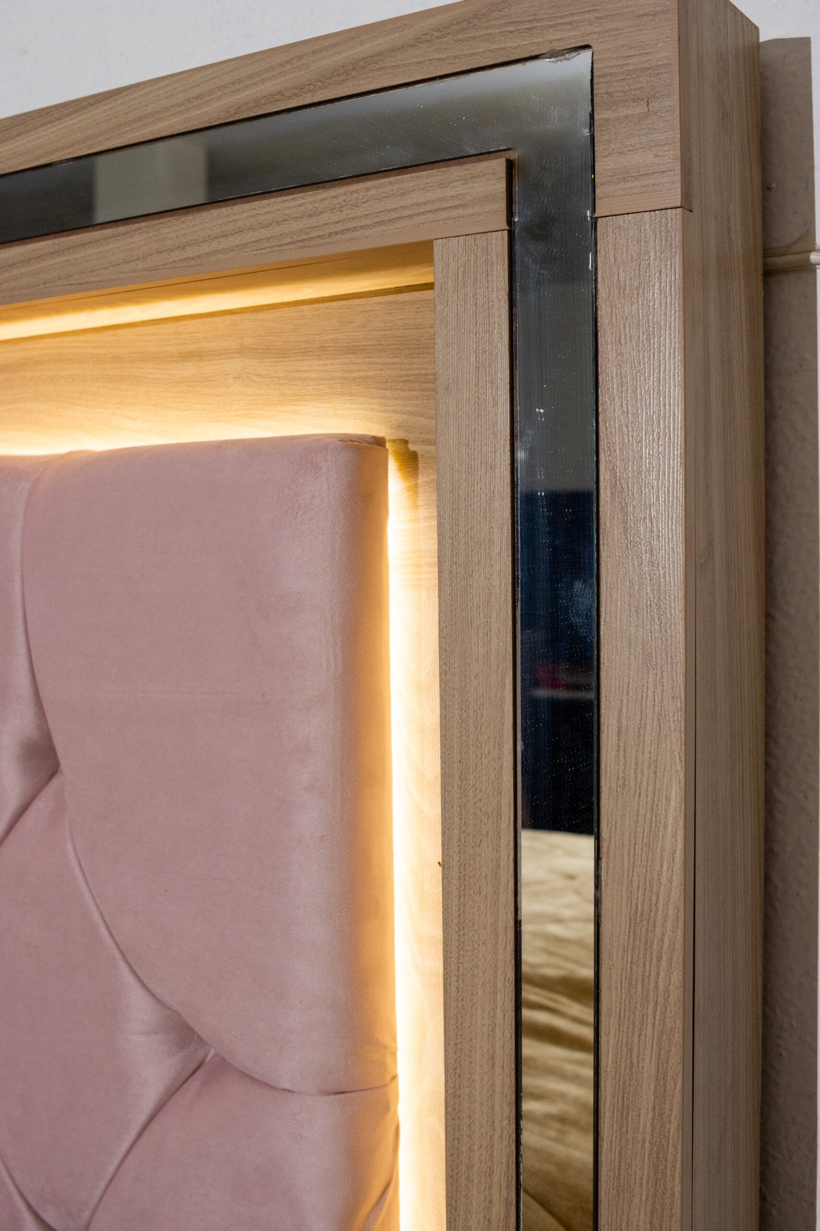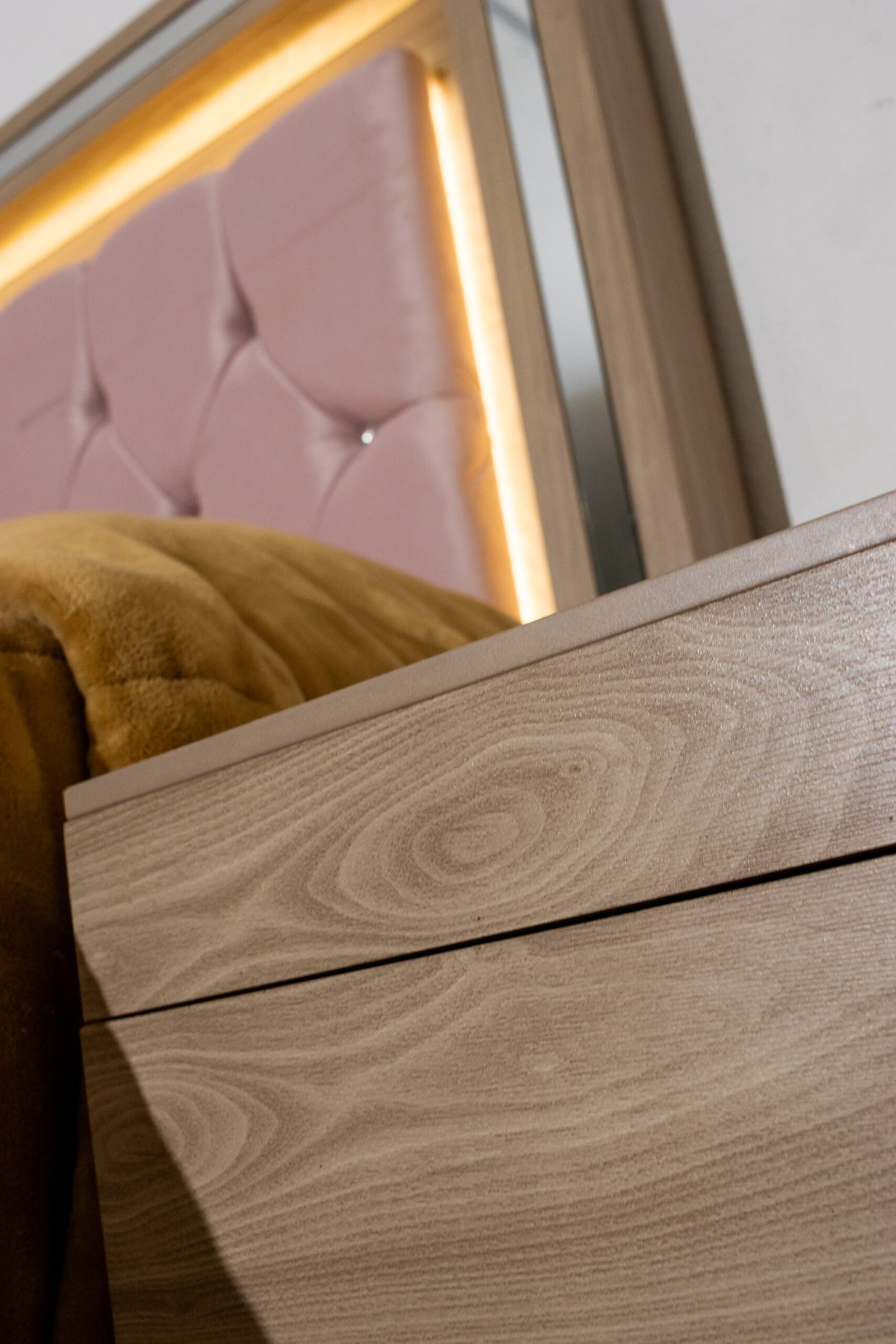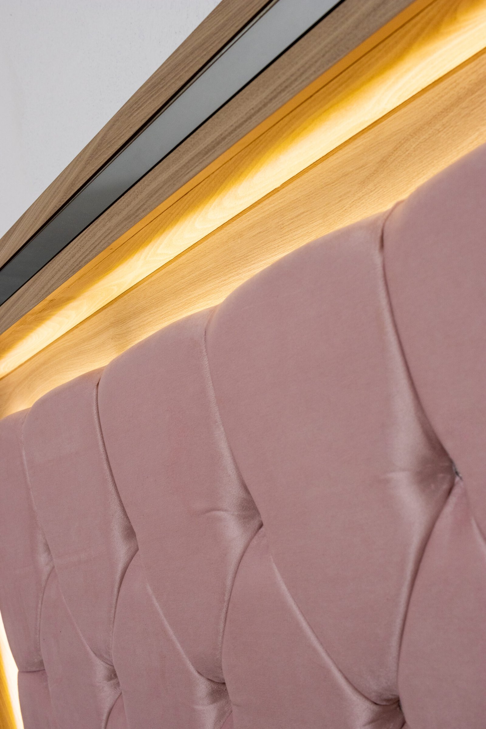 La Recámara Mia se impone desde el primer vistazo: su capitoné con botones de cristal queda enmarcado por una franja de luz LED cálida y un borde espejado que multiplica la luminosidad del espacio. Es una cabecera que de noche se transforma.