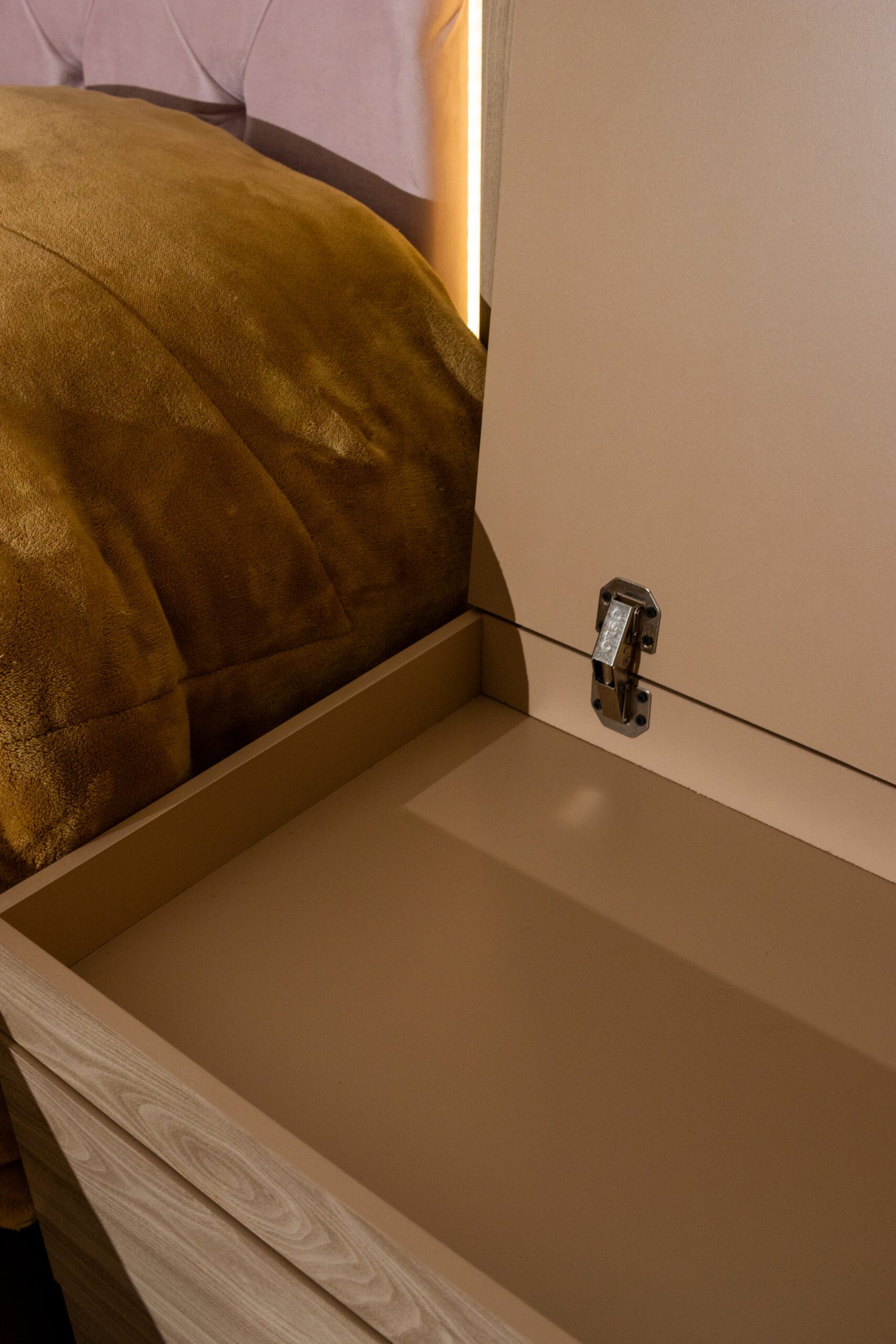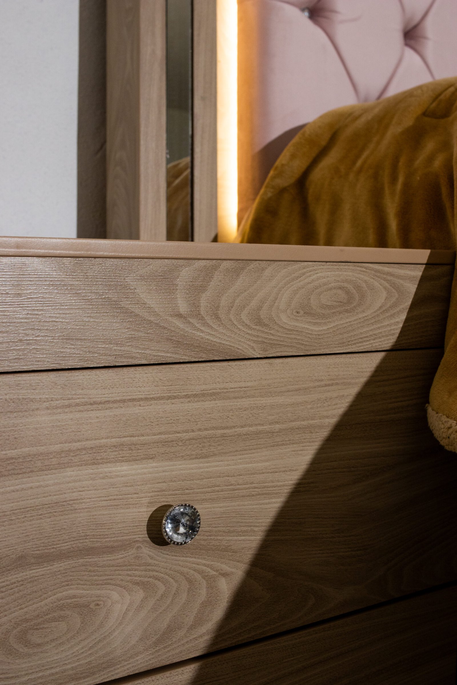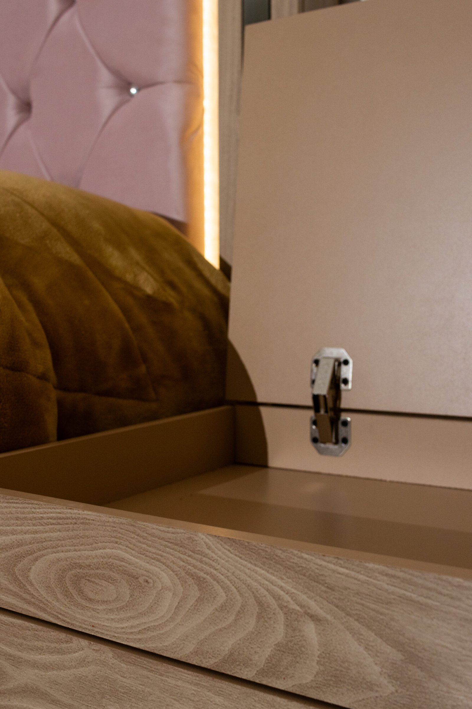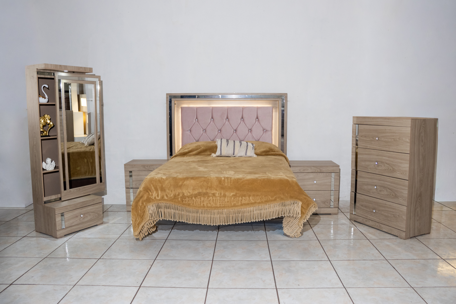 La Recámara Mia se impone desde el primer vistazo: su capitoné con botones de cristal queda enmarcado por una franja de luz LED cálida y un borde espejado que multiplica la luminosidad del espacio. Es una cabecera que de noche se transforma.
