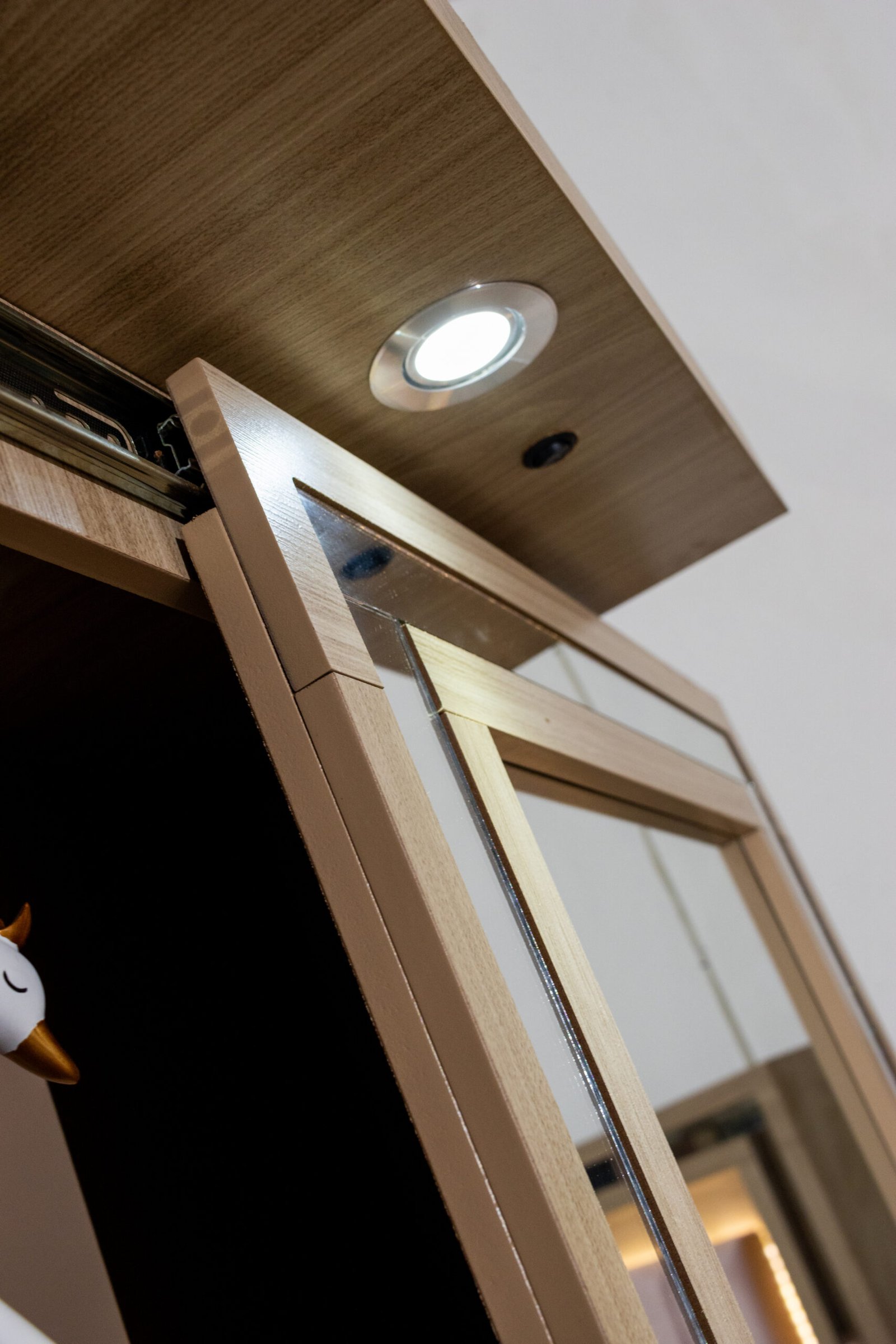 La pieza que más llama la atención es la torre con espejo deslizable de cuerpo completo: a simple vista es un elegante espejo de pie con repisas decorativas abiertas, pero al deslizarlo revela un espacio interior con compartimentos para guardar lo que prefieras mantener discreto. Un detalle de diseño que no deja de sorprender.