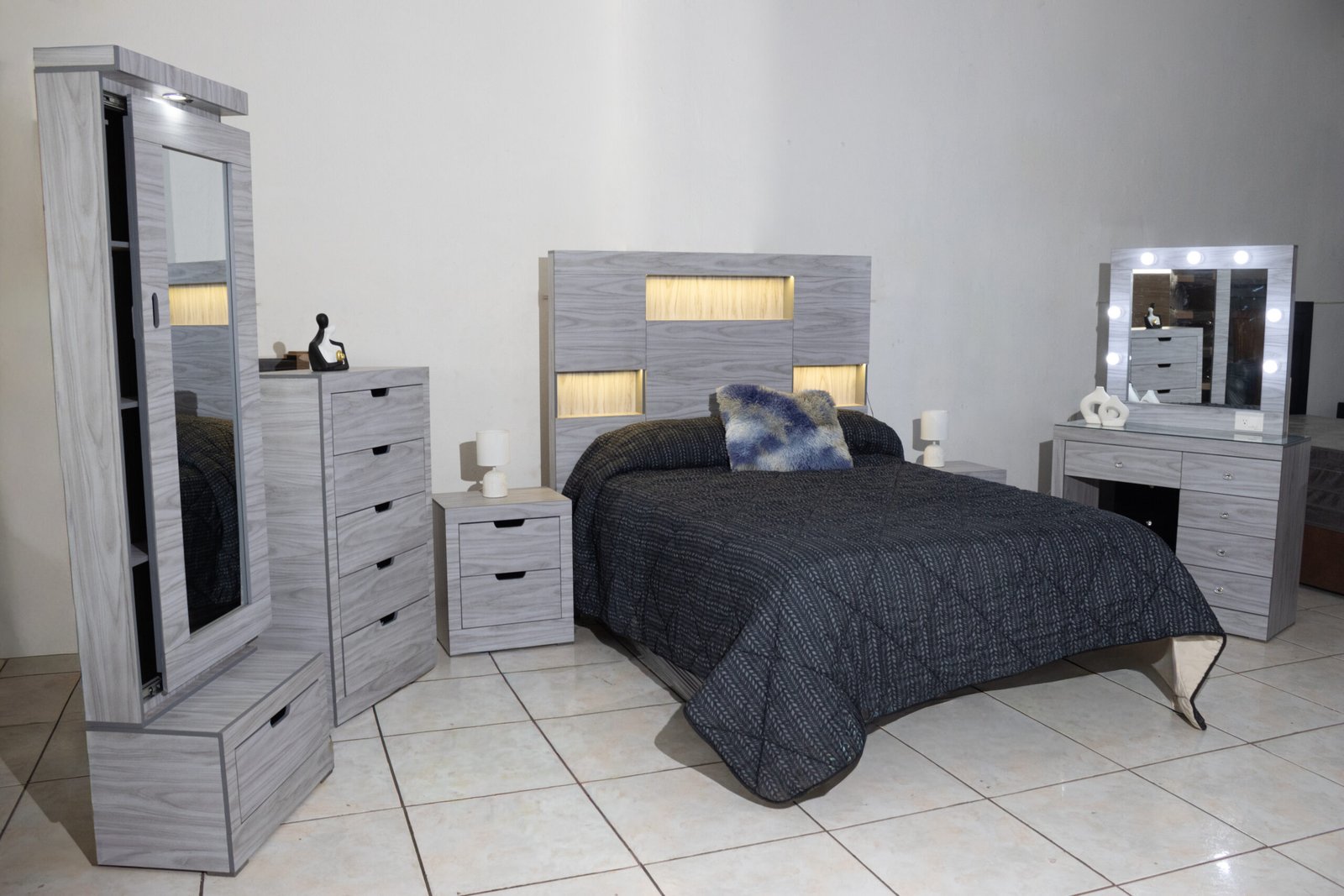 Lo primero que se nota en la Reny es su cabecera panorámica: un panel central de madera con veta natural que se extiende hacia ambos lados con módulos espejados iluminados por luz LED cálida. El resultado es una pared de cabecera que ocupa el espacio completo detrás de la cama, creando una sensación de amplitud y calidez que pocas recámaras logran.
