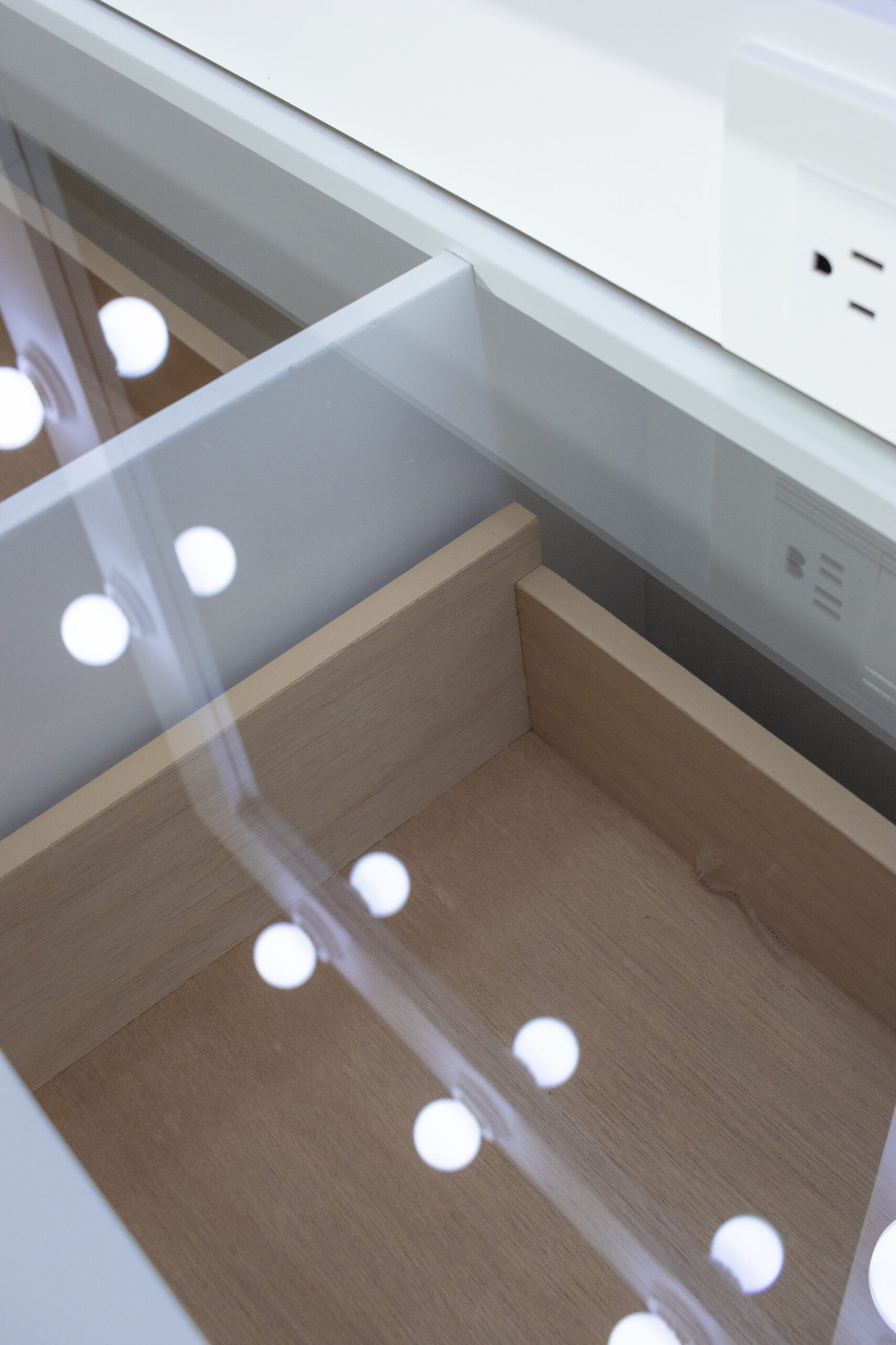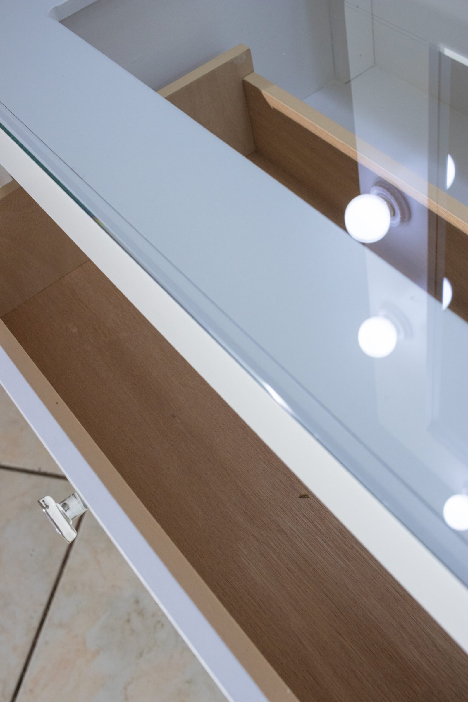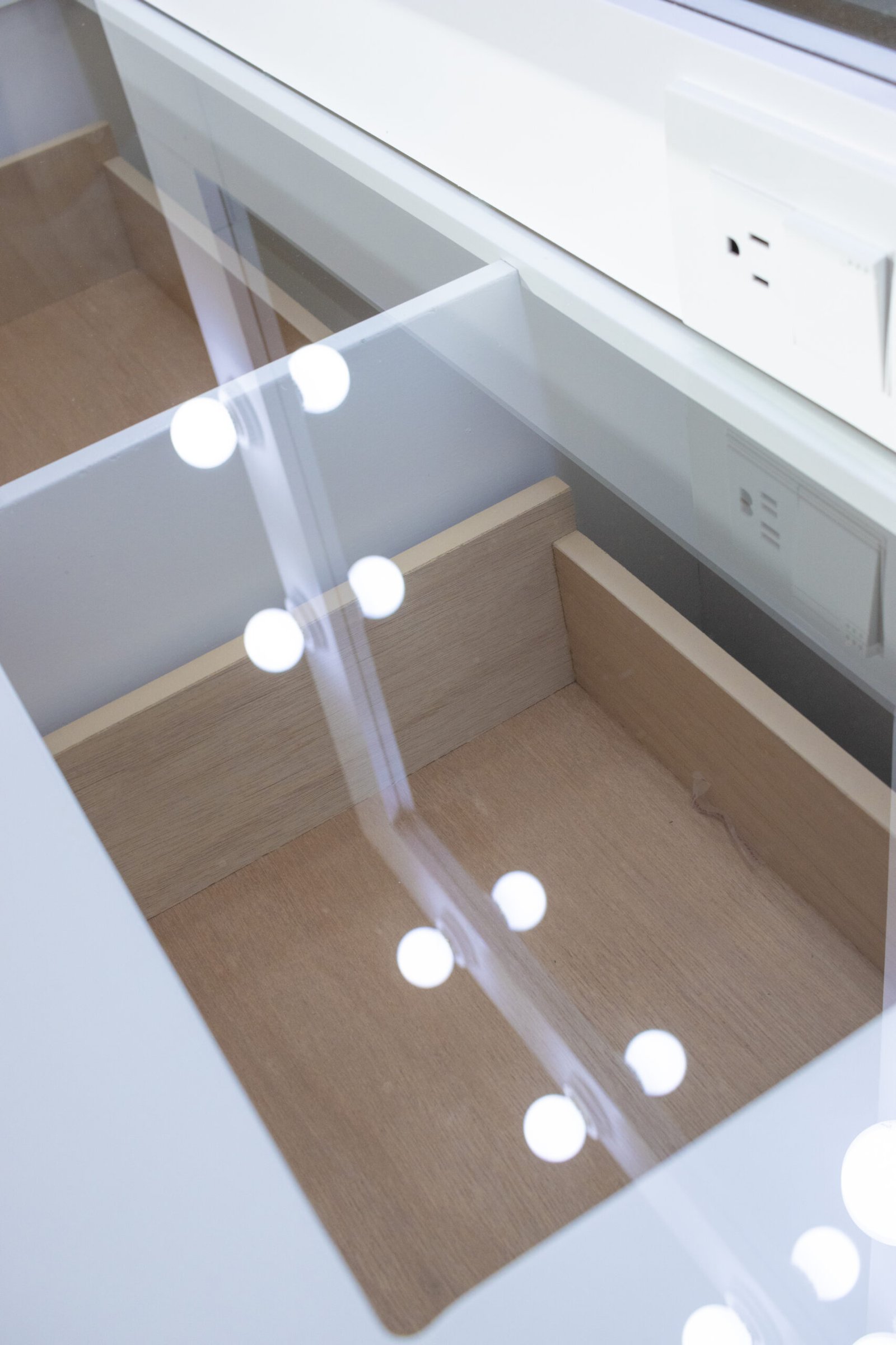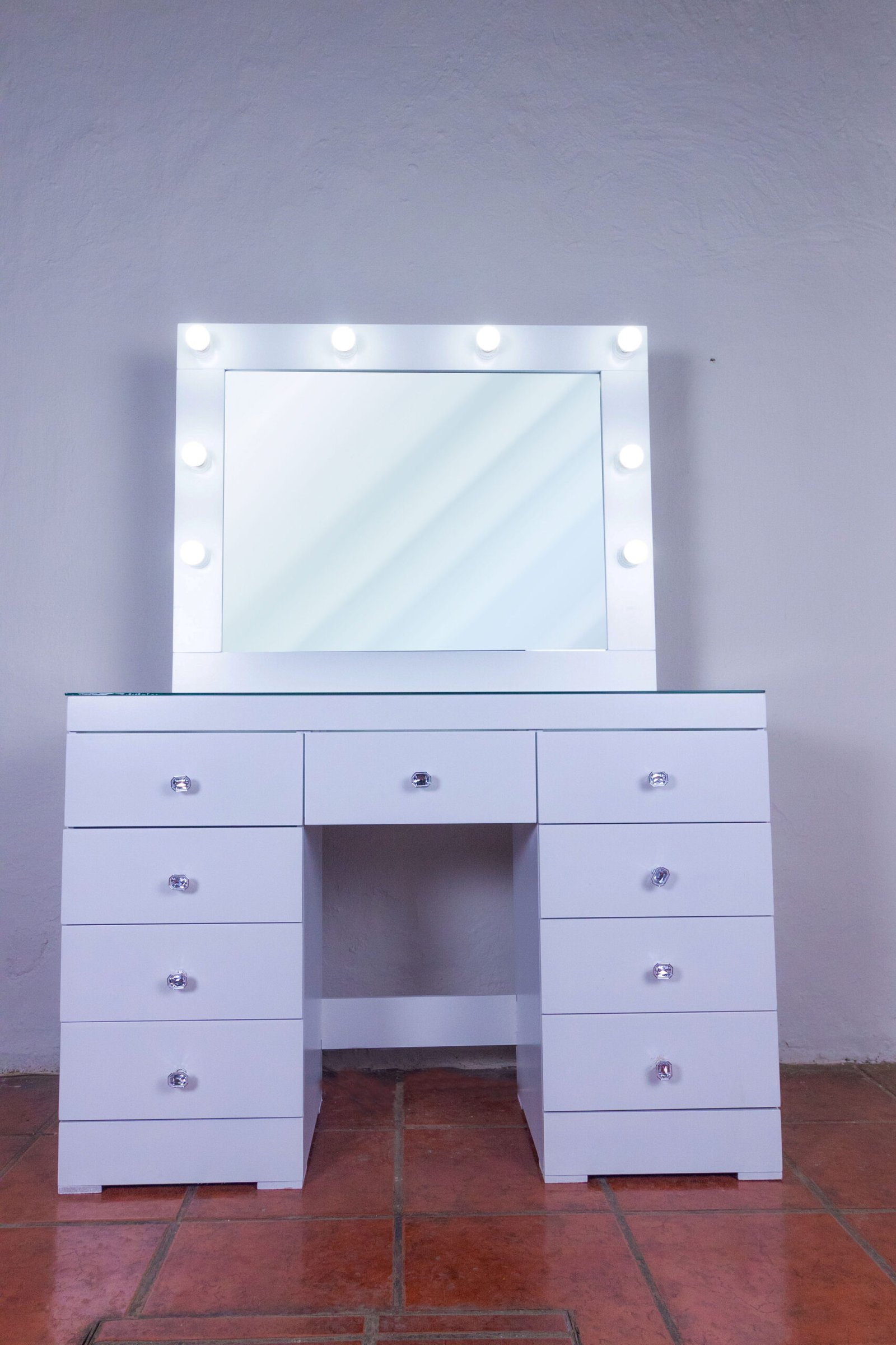 Todos los cajones llevan jaladores de cristal facetado que añaden un detalle de lujo al conjunto. El lado izquierdo queda completamente abierto como espacio para sentarse, generando un nicho cómodo y funcional. El tocador incluye además un contacto eléctrico integrado en el marco del espejo, para conectar secador, rizador o cualquier herramienta sin cables molestos.